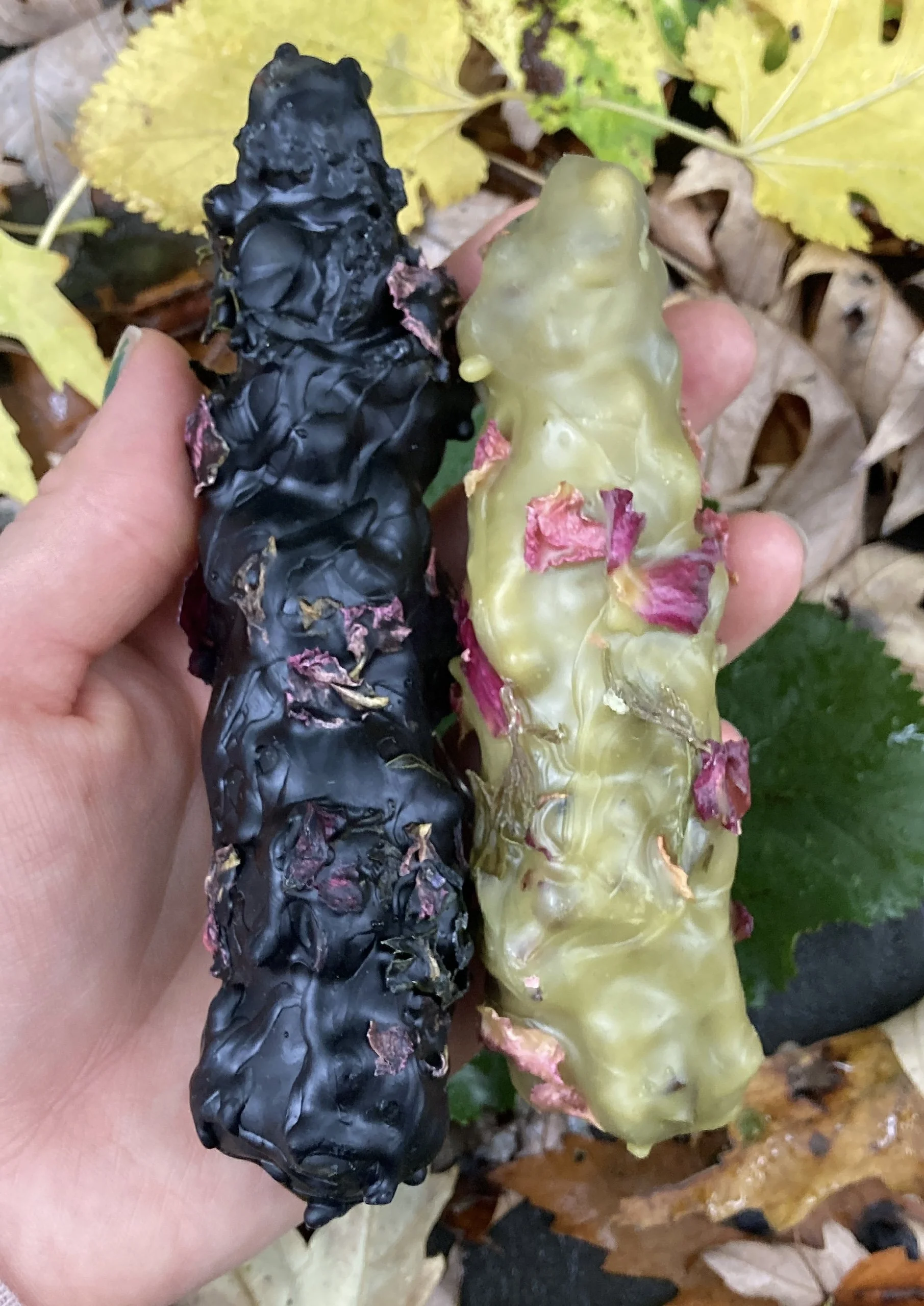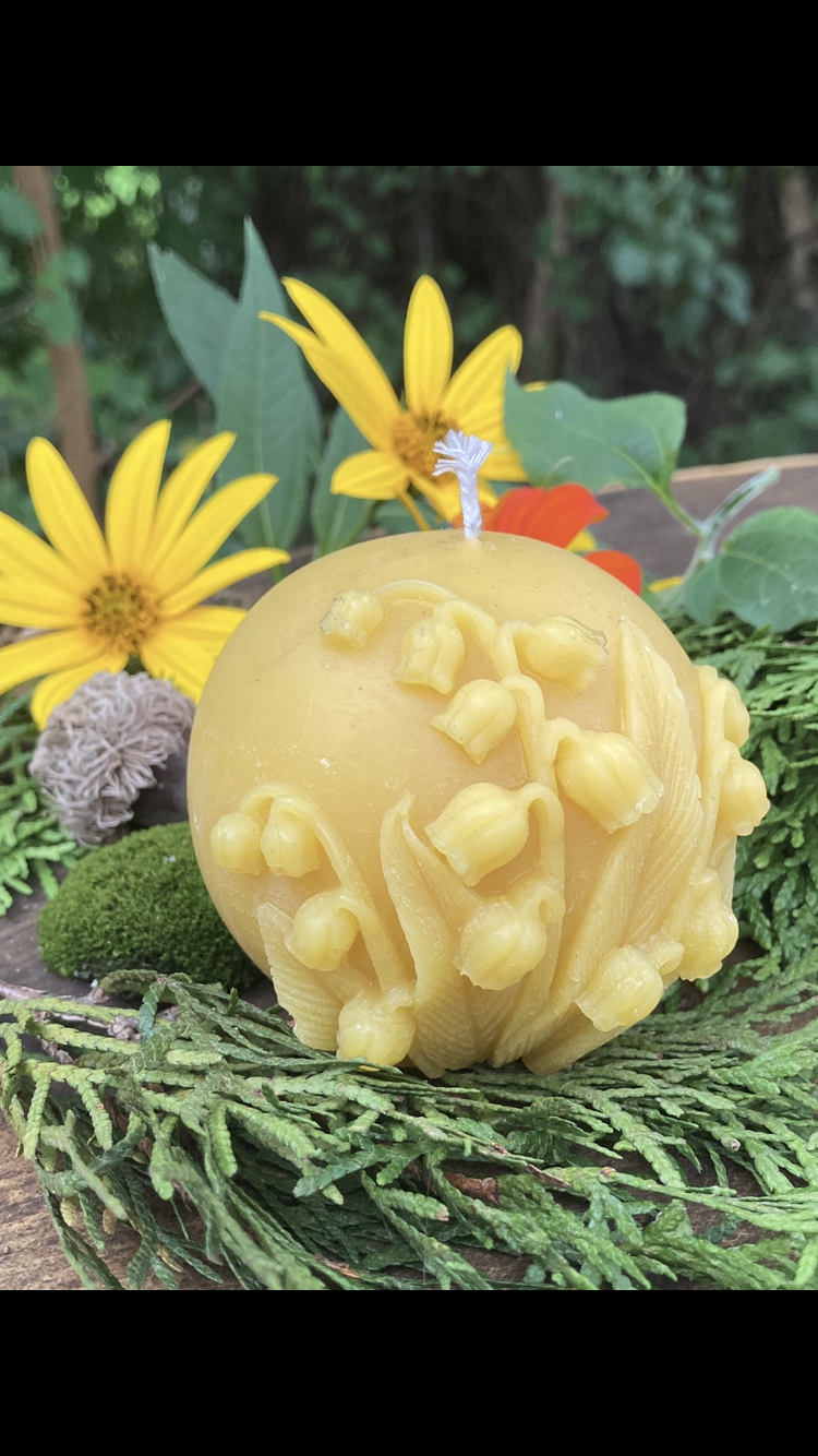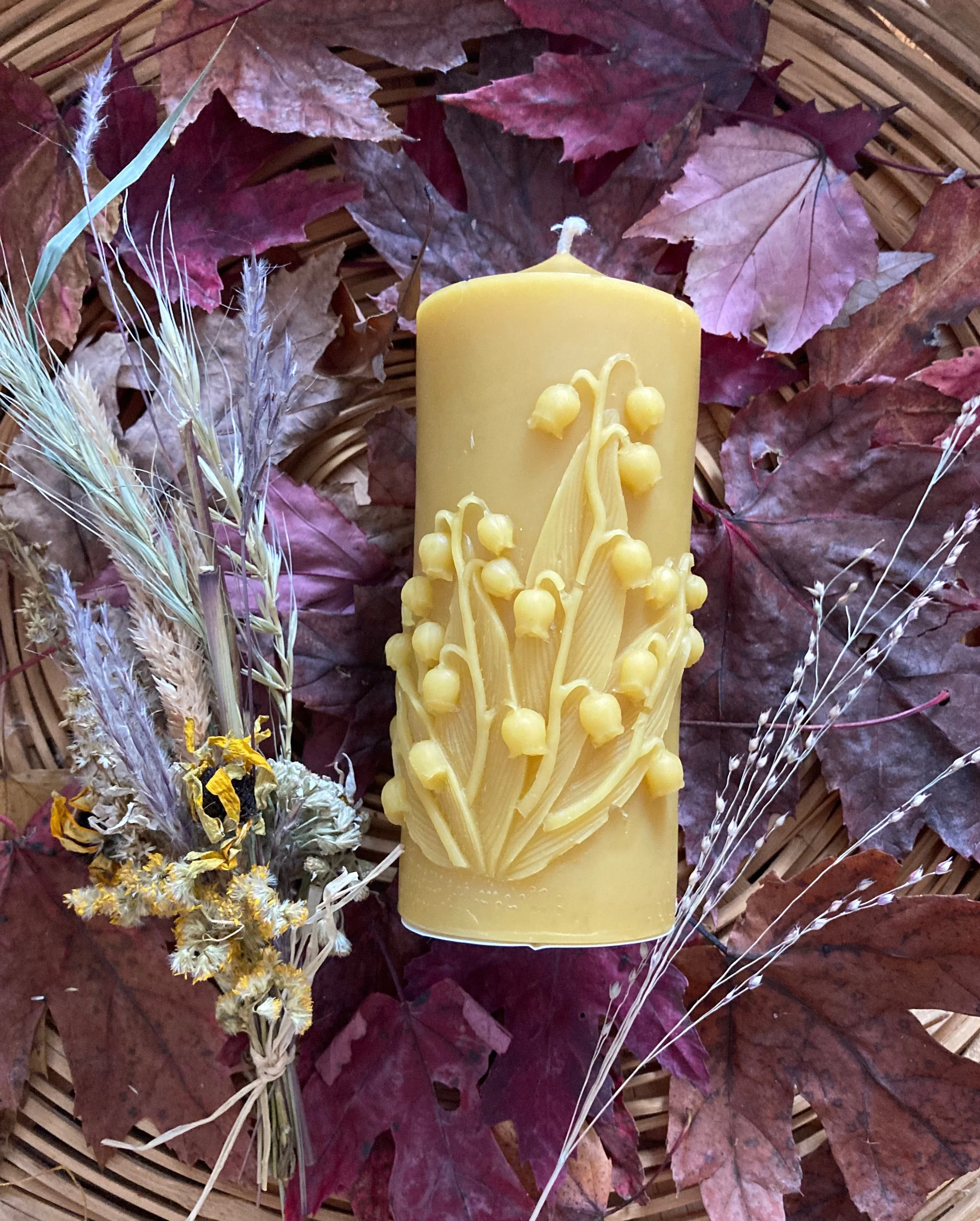 Local Michigan beeswax creates this elegant Lily of the Valley pillar candle, and spent natural indigo and charcoal is added for the green version. To burn, trim the wick slightly for best burning experience. Do not burn unattended! Burning times may vary, ~10+ hours.